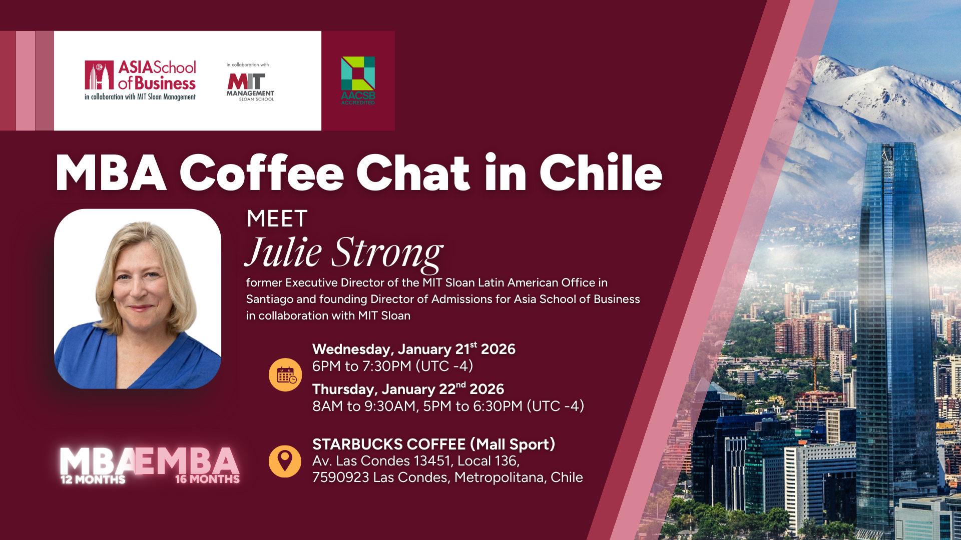Join Julie Strong, former Executive Director of the MIT Sloan Latin American Office in Santiago and founding Director of Admissions for Asia School of Business in collaboration with MIT Sloan will host you for an exclusive Coffee Chat + Ask Me Anything (AMA) session — live in Santiago, Chile. This casual, interactive conversation is designed for professionals in the region exploring what comes next.