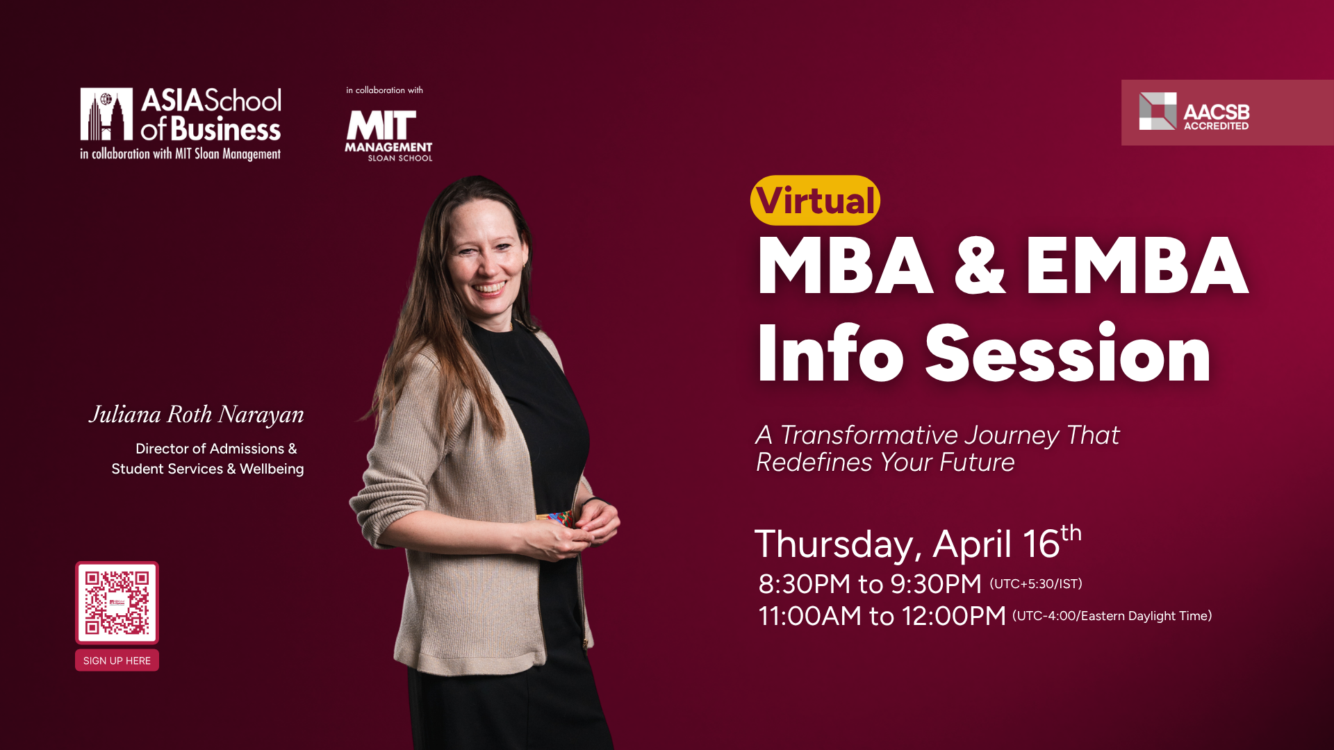 Join Juliana Roth, ASB’s Director of Admissions and Student Services & Wellbeing for an exclusive Virtual MBA Info Session. This casual, interactive session is designed for international and local professionals exploring what comes next.